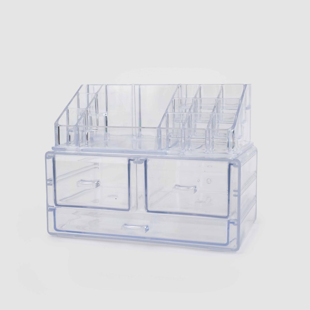 استند سه کشو متوسط با رویه ساده، یک نظمدهنده کاربردی و شیک برای لوازم آرایشی و بهداشتی است.