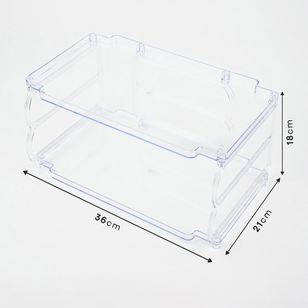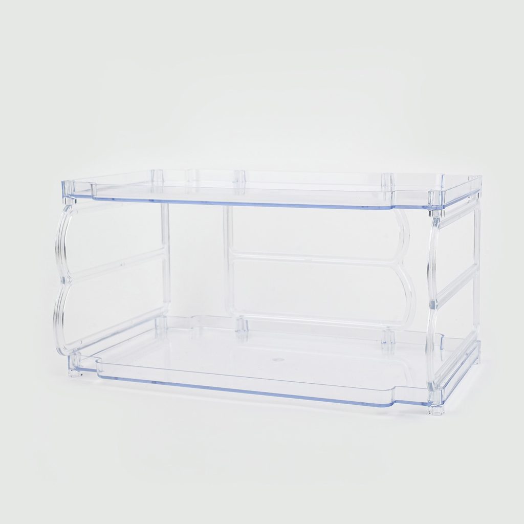 طراحی سادهی استند راف دوطبقه کمک میکنه از فضای عمودی بیشترین استفاده رو ببری؛ بدون اینکه میز، کابینت یا قفسه شلوغ بهنظر بیاد. شفاف بودن بدنه باعث میشه تمام وسایل داخل آن مشخص باشه و همیشه سریعتر به وسایل موردنیازت دسترسی پیدا کنی.